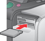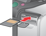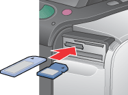 Turn the printer on, open the memory slot cover, then insert a memory card as shown in the illustration.