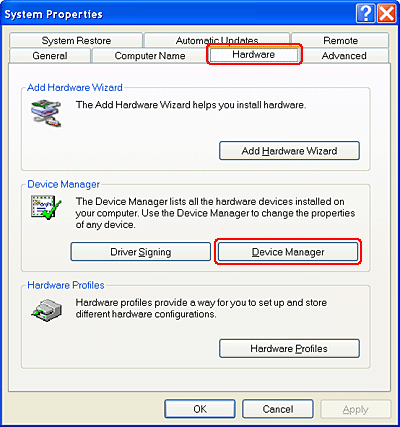 | For Windows XP and 2000, click on the Hardware tab, then click on the Device Manager button. For Windows 98 and Me, click on the Device Manager tab. |