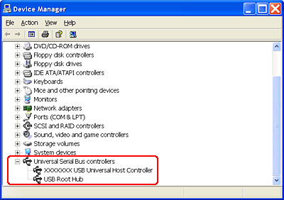 | Click on the Universal Serial Bus controllers option, and check if the USB Universal Host Controller and the USB Root Hub are identified. If the USB Universal Host Controller and the USB Root Hub are identified, your Windows operating system provides USB support. |
