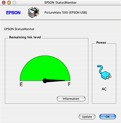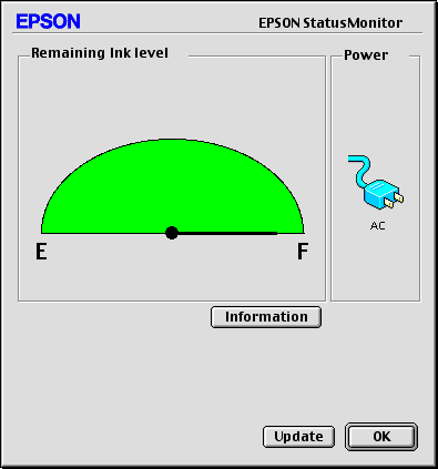 The graphic displays the amount of ink that was remaining when EPSON StatusMonitor was first opened. To update the ink-level information, click Update.