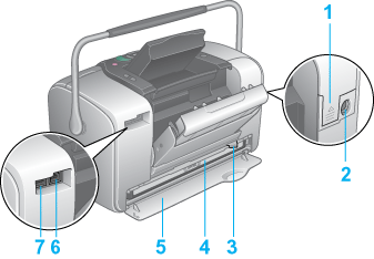 7. EXT/IF (USB) port: Used to connect the optional Bluetooth Photo Print Adapter or external storage devices and digital cameras that have USB DIRECT-PRINT functionality, to the printer.