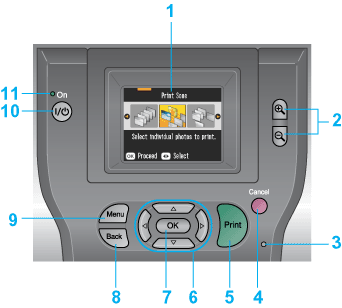 4. Cancel button: Cancels print operations, or the settings on the LCD panel.