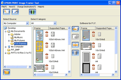 EPSON PRINT Image Framer Tool lets you add colorful, creative frames to your favorite photos. Choosing from a variety of frames, you can create impressive photo greeting cards, photo albums, and more. You can also create or edit your original P.I.F. Frames.