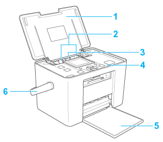 5. Front cover: Receives the ejected paper. Open the cover to insert or eject the memory card.