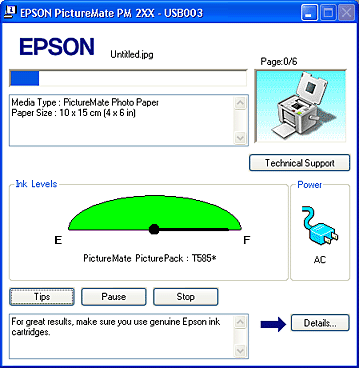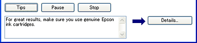 Tips for getting the most out of your Epson printer driver appear in the text box at the bottom of the progress meter window. A new tip appears every 30 seconds. For more details on the tip displayed in the window, click the Details button.