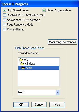You can increase print speed by selecting certain settings in the Speed & Progress window. Click the Speed & Progress button on your printer driver’s Maintenance window. The following screen appears.