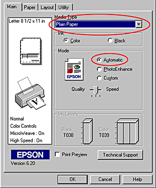 Click the Main tab, and then select Plain Paper as the Media Type setting and Automatic as the Mode setting.