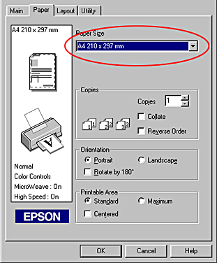 Click the Paper tab, and then select A4 as the Paper Size setting.