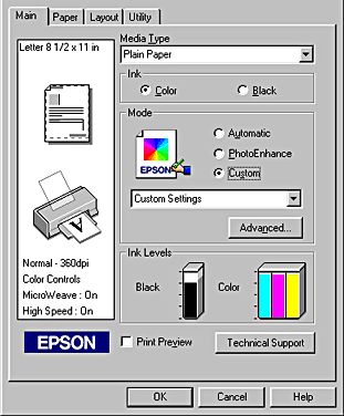 When you select a custom setting, other settings, such as Print Quality, Halftoning, and Color Adjustment, are made automatically. Changes to these settings are reflected in the display at the left side of the Main menu.
