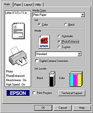 Selecting PhotoEnhance also makes the Digital Camera Correction check box available. Select this check box when you are printing photos taken with a digital camera, to give your printed images the smooth, natural appearance of photographs taken with a film camera.