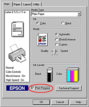 When you send a print job to the printer, the EPSON Print Preview window opens, allowing you to make changes before printing.