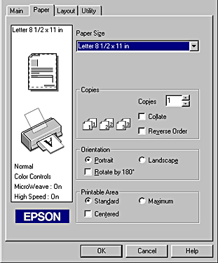 Use the options under Printable Area to adjust the total area available for printing. To center the printout, select Centered. To increase the printable area, select Maximum. |