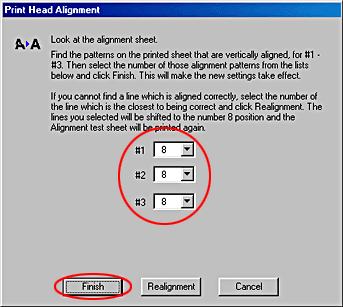 From each pattern on the printed test sheet, choose the vertical line that is aligned best. For each pattern, select the corresponding line number from the appropriate list in the Print Head Alignment dialog box, and then click Finish to apply the new settings.