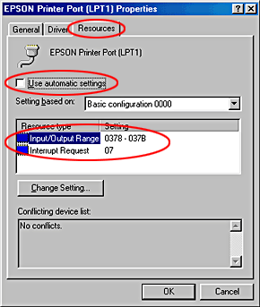 | Click the Resources tab, and then clear the Use automatic settings check box. Write down the Input/Output Range settings shown in the resource settings box. |