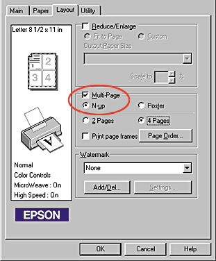 | Select the Multi-Page check box on the Layout menu (Windows) or in the Layout dialog box (Macintosh). Then, select the N-up. |