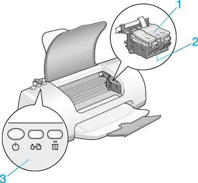1. Ink cartridge clamps: Hold the ink cartridges in place. Open only when installing or replacing ink cartridges.
