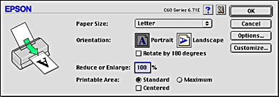 In the Page Setup dialog box, you can change the paper size, specify the paper orientation, rotate your document by 180 degrees, reduce or enlarge your printout, and adjust the printable area.