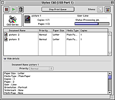 After you send a print job to the printer, you can use the EPSON Monitor3 utility to check, cancel, or change the priority of print jobs that are queued for printing. This utility also shows the status of the job currently being printed.