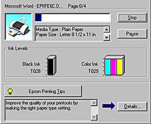 EPSON Spool Manager is similar to Windows Print Manager. If it receives two or more print jobs at one time, it holds them in the order that they were received (with printers on a network this may be called a print queue). When a print job reaches the top of the line, the EPSON Spool Manager sends the job to the printer. From the Spool Manager, you can cancel print jobs. You can also view print status information about the print jobs which have been sent to your printer, as well as pause and resume or restart selected print jobs.
