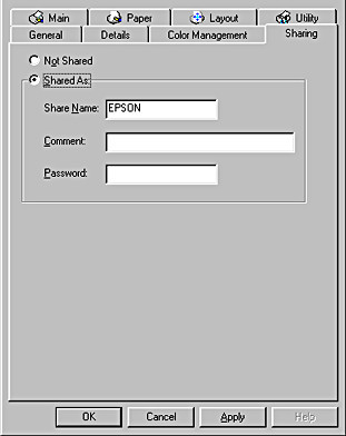 Select Shared As, then type the printer information as required and click OK.