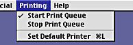 Choose Start Print Queue to resume printing, Stop Print Queue to stop printing, or Set Default Printer to select the printer as the default printer.