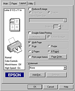 Select N-up as the Multi-Page setting on the Layout menu to print two or four pages of your document on one sheet of paper.