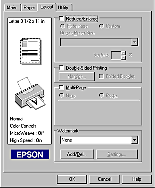 You can make Reduce/Enlarge, Multi-Page, and Watermark settings on the Layout menu. Refer to the appropriate section below.