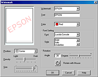 Make sure that the appropriate watermark is selected in the Watermark list box, then make Color, Position, Density, Size, Font, Font Style, and Angle settings. (For details, see online help.) Your settings are reflected in the display at the left side of the dialog box.