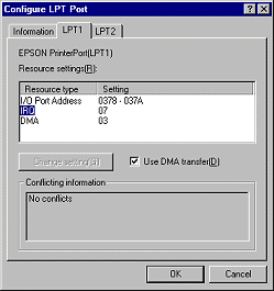 If you have connected your printer to LPT2 or LPT3, making IRQ and DMA settings here may speed up printing. Click Change setting and input the same configuration numbers for IRQ and DMA which you have made with your expansion board. See your computer documentation to determine the settings for IRQ and DMA.