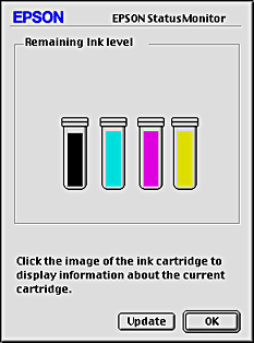 You can also use this utility to check ink levels before printing. When open, EPSON StatusMonitor displays the amount of ink remaining at the time it was opened. To update the ink level information, click the Update button.