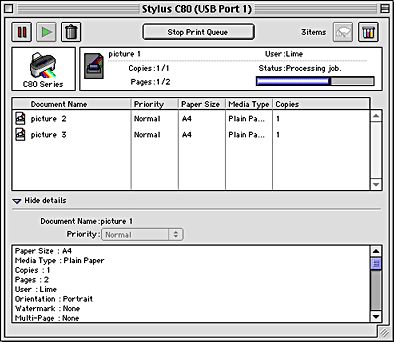 After you send a print job to the printer, you can use the EPSON Monitor3 utility to check, cancel, or change the priority of print jobs that are queued for printing. This utility also shows the status of the job currently being printed.