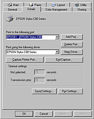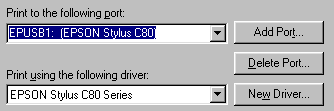 If EPUSBx: (EPSON Stylus C80 or EPSON Stylus C70) is displayed in the Print to the following port list box, then the USB printer device driver and printer software is installed correctly. If the correct port is not displayed, proceed to the next step.