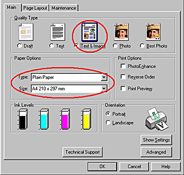 Click the Main tab, and then select Plain Paper and A4 as the Paper Options settings and Text & Image as the Quality Type setting.