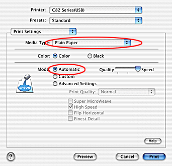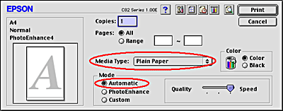 Select Plain Paper as the Media Type setting and Automatic as the Mode setting.