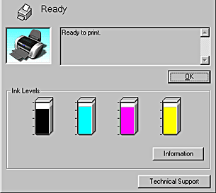 If any of the ink cartridges installed in the printer is broken, incompatible with the printer model, or is installed improperly, EPSON Status Monitor 3 will not display an accurate calculation for the amount of ink remaining in any of the ink cartridges. Be sure to replace or reinstall any ink cartridge indicated by EPSON Status Monitor 3.