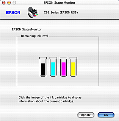 The graphic displays the amount of ink that was remaining when EPSON StatusMonitor was first opened. To update the ink-level information, click Update.
