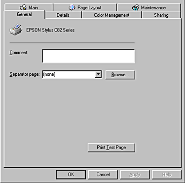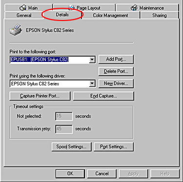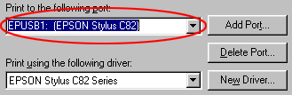 If EPUSBX: (EPSON Stylus C82) is displayed in the Print to the following port list, then the USB printer device driver and printer software are installed correctly. If the correct port is not displayed, proceed to the next step.