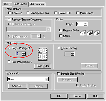 | For Windows, select Pages Per Sheet under Multi-Page on the Page Layout menu, and then click the up or down arrow to choose 2 or 4. |