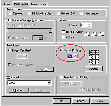 | Select the Poster Printing option under Multi-Page on the Page Layout menu, and then click the up or down arrow to select 2x2, 3x3 or 4x4. |