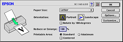 Use the options in the Printable Area box to adjust the total area available for printing. If you want to center the printout, click Center. If you need to increase the printable area, click Maximum. Do not select Maximum when using EPSON Ink Jet Back Light Filmm.