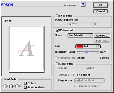 Select the watermark you want to print from the Name list, then select its position, size, color, and intensity. You can change the position and size of the watermark by dragging it with your mouse in the preview window on the left.