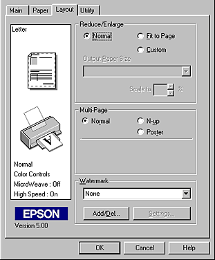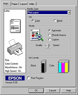In addition to making groups of settings that affect overall print quality, you can also modify individual aspects of the print style and layout using the Paper and Layout menus. See Modifying the printout style for Windows 95, 98 and NT 4.0 or Modifying the printout style for Windows 3.1.