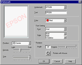 | From the Watermark list box, select the watermark you want to make settings for, then make color, position, density, and size settings. Your settings appear on the left side of the dialog. After you make settings, click OK. |