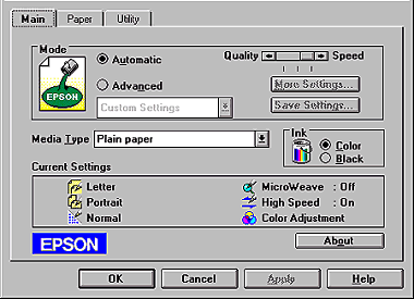 The quickest and easiest way to start printing. See Using the Automatic mode for Windows 95, 98 and NT 4.0 or Using the Automatic setting for Windows 3.1. |