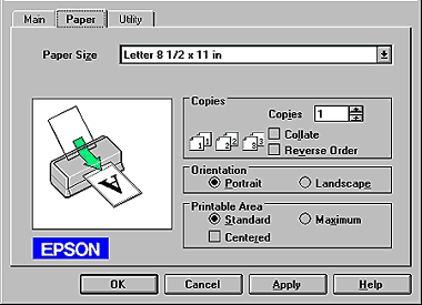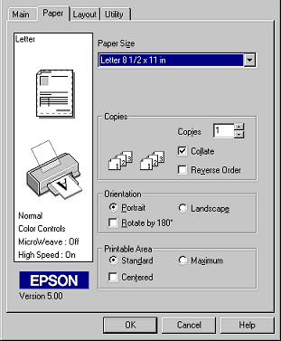 Use the options in the Printable Area box to adjust the total area available for printing. If you want to center the printout, click Center. If you need to increase the printable area, click Maximum. Do not select Maximum when using EPSON Ink Jet Back Light Filmm.