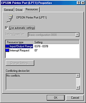 | Click the Resources tab, then deselect the Use automatic settings check box. Write down the Input/Output Range settings shown in the Resource settings box. |