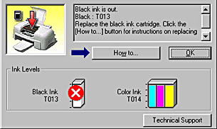 When an ink cartridge is empty or nearly empty, click the How to button in the Status Monitor window to move the print head to the ink cartridge replacement position. Follow the on-screen instructions to replace the cartridge. (The sample below is from Windows.)