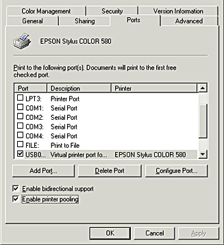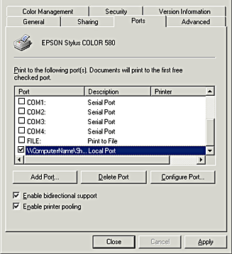 On the Ports menu, make sure that the new port is included in the list and that the corresponding check box is selected. Click OK to close the printer driver.