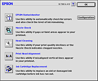 EPSON printer utilities allow you to check the current printer status and to perform printer maintenance from your computer screen. To access the utilities, click the Utility icon button in the Print or Page Setup dialog box, then click the button for the utility you want to use.