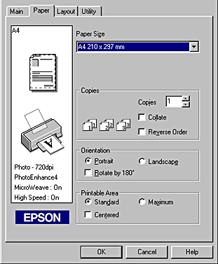 On the Paper menu, you can set the paper size, the number of copies, the orientation of your printout, and the printable area. On the Layout menu, you can automatically match the document size to the paper size, print two or four pages on a single sheet of paper, print poster-size images by enlarging one page to cover several sheets, or place watermarks on documents.
